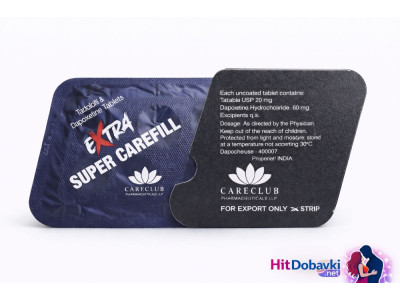 EXTRA SUPER CAREFILL 100 mg е нов революционен продукт комбиниращ действието на Tadalafil 40 mg ( Generic Cialis, Генерик Циалис ) ( за много по-корава, стабилна и качествена ерекция продължаваща повече от 52 часа ) и Dapoxetine 60 mg ( за лечение на преждевременна еякулация и бързо изпразване ). Предимствата са очевидни: оптимално сексуално представяне с невероятно корава и стабилна ерекция съпроводена със значително задържане и контрол на изпразването.