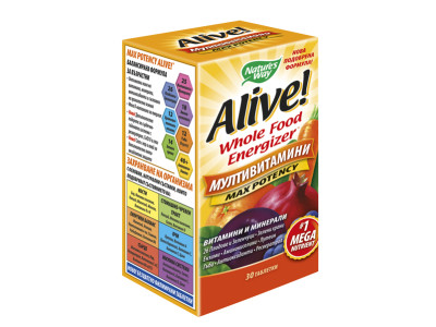Действие: Защо Alive не са просто поредните мултивитамини? Alive не е просто смес от витамини и минерали, а своеобразна суперхрана събрана в една таблетка! В нейния уникален състав, освен витамини и минерали, са включени богата гама екстракти от повечето известни суперхрани. В нея ще откриете богатите на хлорофил зеленолистни зеленчуци, пълните с антиоксиданти боровинки и къпини, уникалните по състав и съдържание на протеин водорасли. Специалната смес от китайски гъби в Alive е извор на младост и дълголетие. А за да бъде всичко това добре усвоено, Alive е обогатена с естествени храносмилателни ензими! Alive e суперхраната, която е напълно съвместима с напрегнатото ни ежедневие. Тя е един достъпен източник на здраве и енергия! Вече не е нужно да се притеснявате, че не Ви остава време да се храните здравословно! С Alive можете да сте спокойни, че всеки ден приемате така полезните зеленчуци и плодове, и дори повече – богати на микроелементи водорасли и китайски гъби! С Alive ще се почувствате наистина живи и изпълнени с енергия, жизнененост и издръжливост!